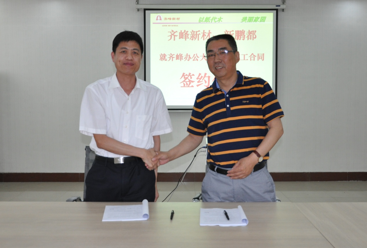2015年6月4日,齐峰办公大楼室内装施工合同签约仪式在公司第一会议室隆重举行,公司副总经理孙文荣和深圳市新鹏都装饰工程有限公司副总经理季洪生代表双方在建筑工程施工合同上签字。公司副总经理李贤明及双方有关部门负责人出席并见证了签约仪式。